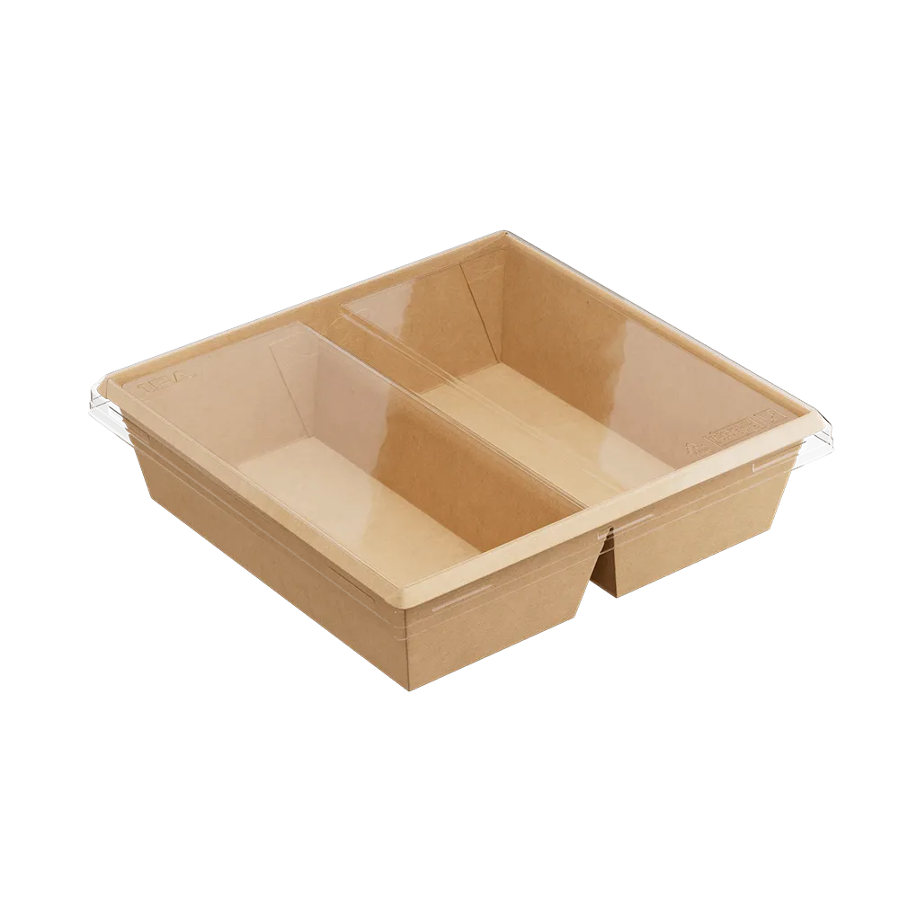 Контейнер OneClick 1200 мл 2 секционный — эко-контейнер нового поколения для доставки и презентации блюд, где важно разделить продукты по секциям; подходит для холодных/замороженных, жирных, горячих блюд и продуктов с жидкими составляющими.