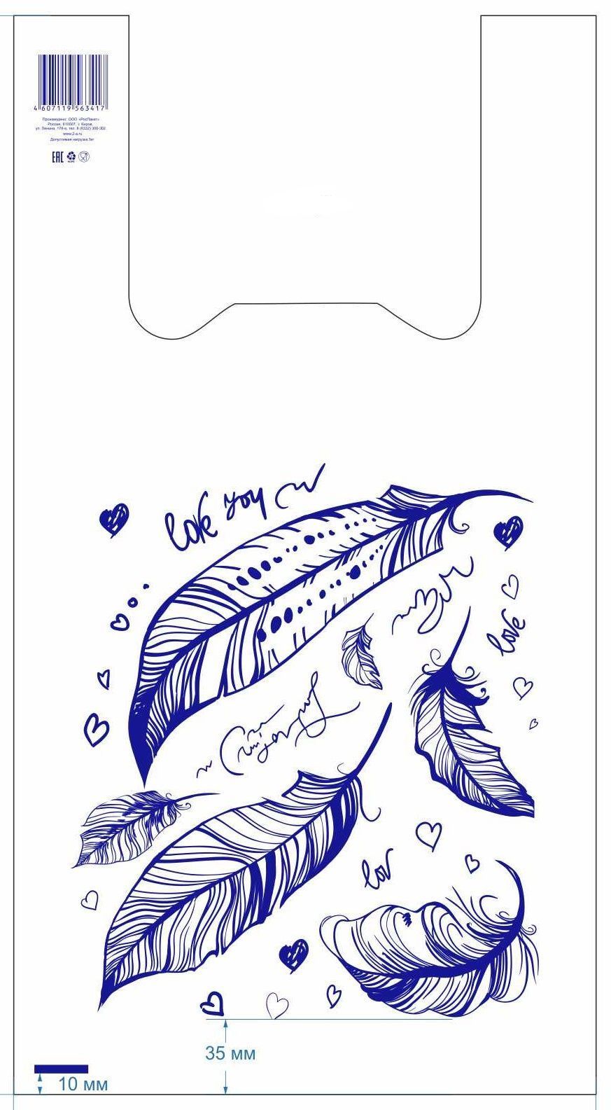 Белый пакет с лёгким дизайном «Перья» выглядит аккуратно и привлекательно, добавляя упаковке более стильный и приятный вид. Подходит для магазинов, где важна не только функциональность, но и визуальное восприятие.